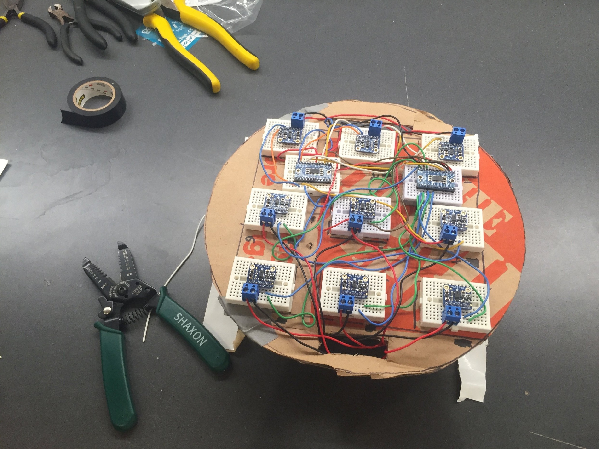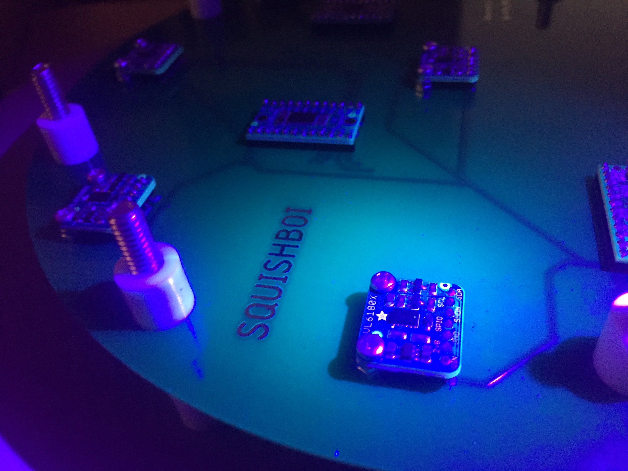SQUISHBOI utilizes cutting edge Time-Of-Flight distance sensors that have only come to market in the last year or two. These micro LIDAR chips are essentially short range single point versions of the sensor technology found in drones and self driving cars! After several rounds of prototyping, I printed a PCB with a 3x3 array of distance sensors to mimic the 3 dimensional sensing abilities of advanced LIDAR cameras that use dot plane projection. The rubberized surface above these sensors gives the data a form of inherent dynamics, squishing any one side will likely have an effect on the rest of the input data. This is especially useful when looking to map SQUISHBOI’s data to interlinked musical parameters within your audio workstation.