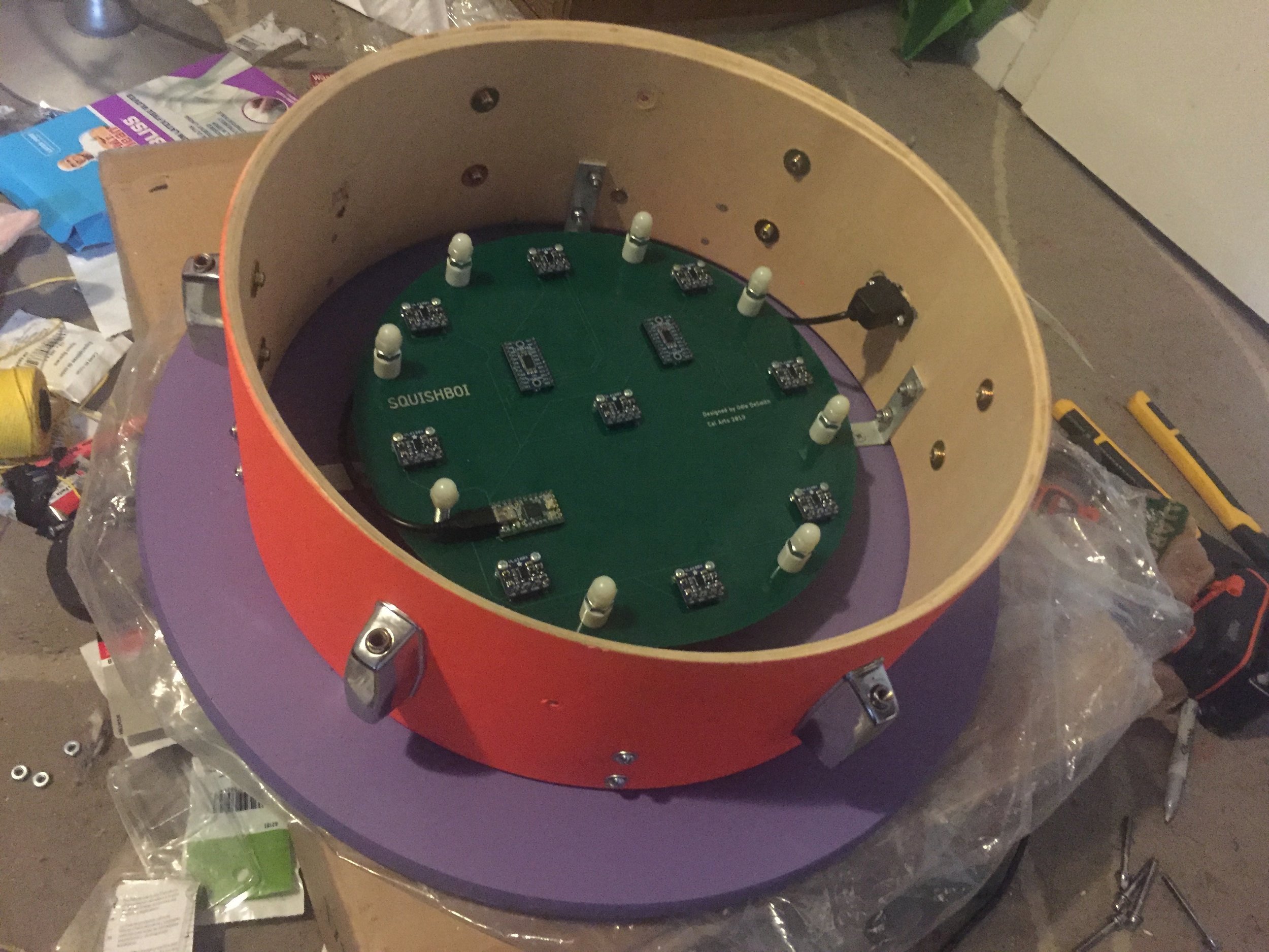 This project started as an assignment for a class I took at CalArts called Interface Design, where I learned about principles of design for interactivity from Ajay Kapur and Andrew Piepenbrink. In the class we were asked to create a controller for sound or other applications that worked in a new and unique way. In short, it had to be something you couldn’t buy off of a shelf. My goal with this project was to create a multifaceted controller through the use of modern sensor technology, inherent dynamics, and artificial intelligence. I was curious to see if I could design an instrument that could be reapplied to any sonic scenario and produce as many relevant and controllable outputs as necessary for the task. With these considerations in mind, the SQUISHBOI was born.